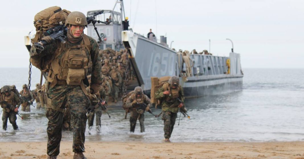 VIRGINIA BEACH — “Oohrah!” rang out as roughly 180 Marines plunged into thigh-deep ocean water Monday, disembarking from an amphibious Naval craft before crawling up the sand dunes of Joint Expeditionary Base Fort Story.