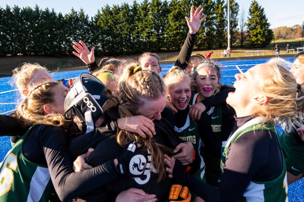Tabb players hoist the state championship trophy to celebrate their 3-0 victory over Poquoson 3-0 in the Class 3 field hockey state championship game at Courtland High School in Spotsylvania, Virginia on Nov. 13, 2022.