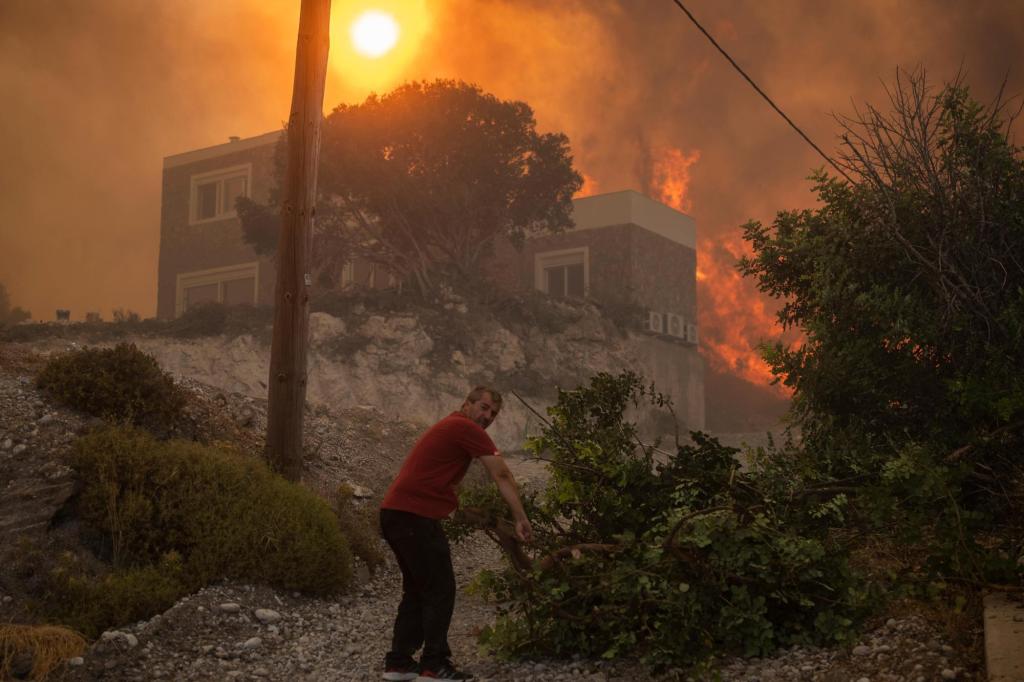 On Rhodes, desperate residents, many with wet towels around their necks to stave off the scorching heat, used shovels to beat back flames approaching their homes, while firefighting planes and helicopters resumed water drops at first light.