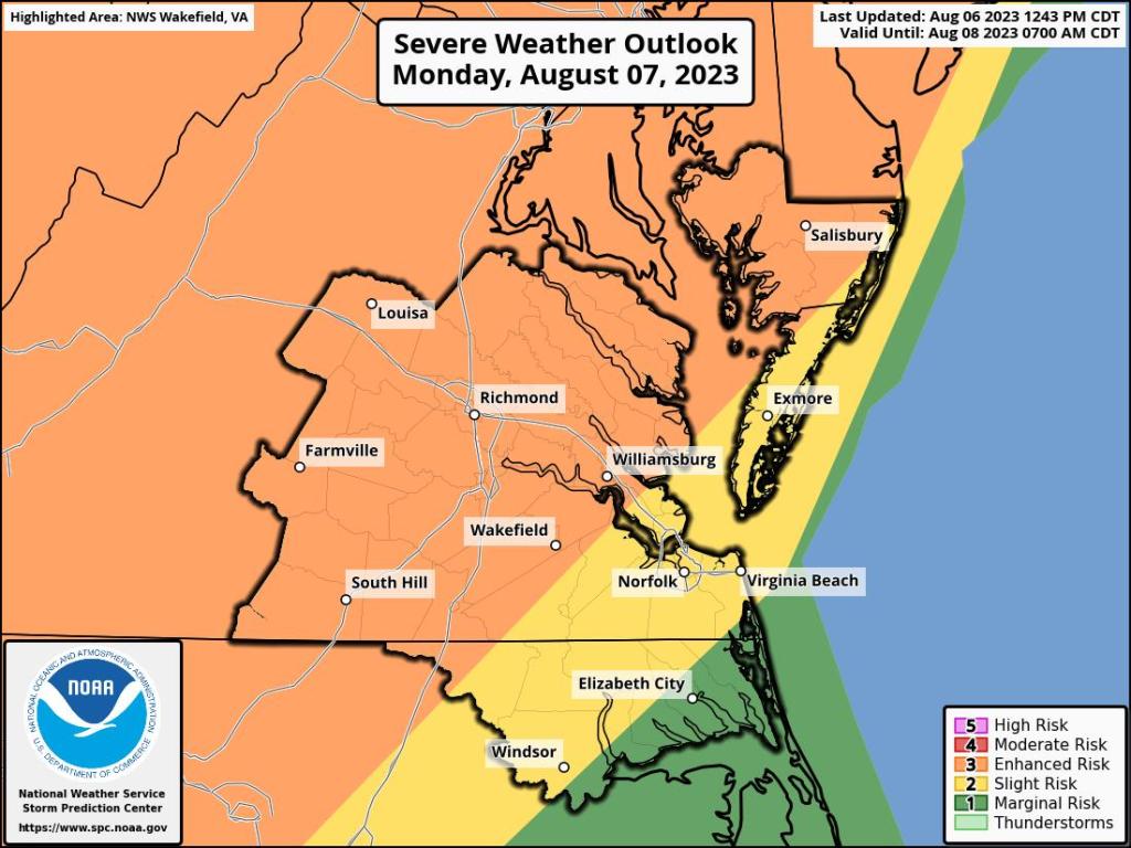 There is more concern (3 out of 5, or “enhanced”) for the areas directly west of Hampton Roads, including the Williamsburg area and Surry and Sussex counties, while Hampton Roads is looking at a “slight” risk (2 out of 5).