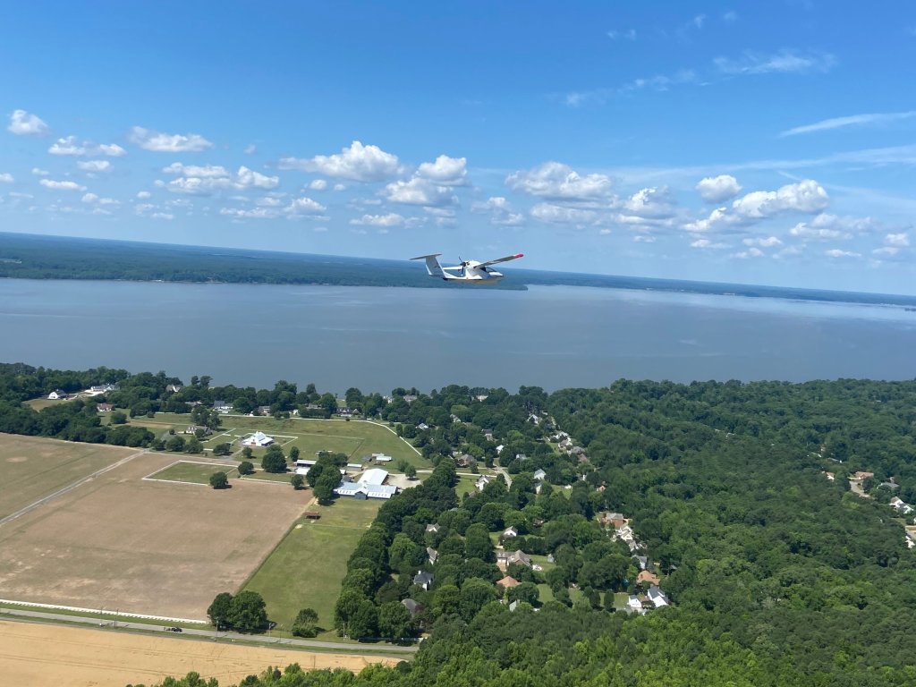 In a recent flight demonstration over the Williamsburg area, pilots demonstrated the plane’s adaptability, making stomach-churning dips and turns before landing on the crystalline James River. The plane functions much like a jet ski on water, twisting and turning over the water and then taking off again with equal ease. On a clear day, the landscape stretches out vast and green, with well-known landmarks such as Jamestown Settlement and its trio of recreated ships made minuscule from up in the air.