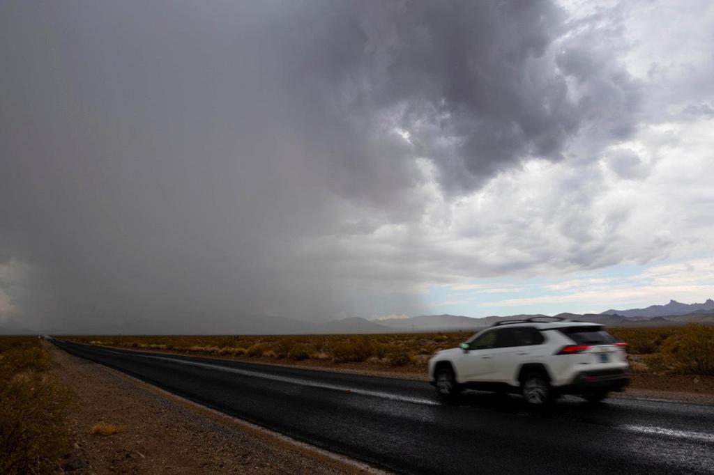 MOJAVE NATIONAL PRESERVE, Calif. (AP) — Firefighters aided by rain fought to contain a massive blaze that swept through the California desert into Nevada and are threaten ing the region’s famous spiky Joshua trees.