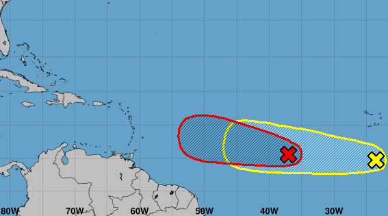 Meanwhile, in the 8 p.m. update, a second wave was shown to be emerging into the eastern Atlantic Ocean off of western Africa. Originally given a 10% chance to develop in the next 48 hours and 20% over the ensuing seven days, at the 2 a.m. Monday update, it was bumped up to a 20% development chance in the next 48 hours and 30% over the next week.